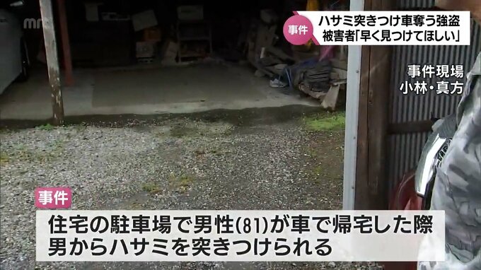 小林市真方にある住宅の駐車場で、この家に住む81歳の男性が外出先から車で帰宅すると、突然、男がハサミを突きつけこう言いました。
