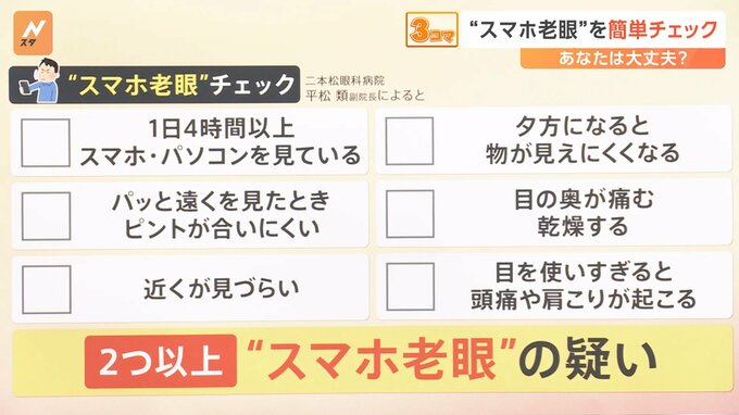 2つ以上当てはまる方は“スマホ老眼”の可能性があるということです。