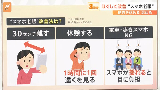 平松医師によると「スマホを目から30cm離す」「1時間に1回は遠くを見て休憩する」「揺れるスマホを見ようとすると、目に負担がかかるので電車や歩きスマホはNG」ということです。