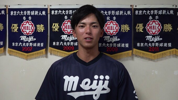 「RCCをご覧のみなさん、明治大学の 宗山塁 です。ぼくの長所は走攻守のバランスのよさと、ここ一番での冷静なプレーです」