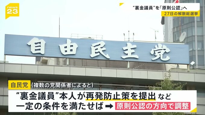10月27日に予定されている衆議院選挙。複数の関係者によると、裏金事件にかかわった議員について、議員本人が再発防止策を提出するなど、一定の条件を満たせば、原則公認する方向で調整されているということです。