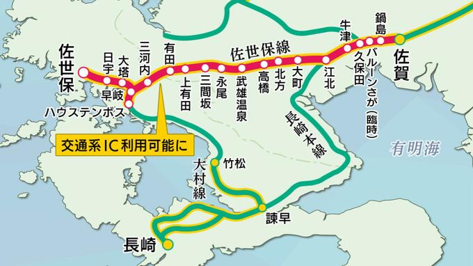ICカードが使えるようになったのは、JR九州の佐世保駅と佐賀駅の間にあるすべての駅とハウステンボス駅のあわせて19駅です。これにより、博多ー佐世保間がICカードで移動できるようになります。