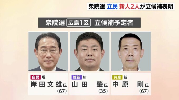広島1区には、自民党現職の岸田文雄氏、日本維新の会の新人・山田肇氏、共産党新人の中原剛氏が立候補を予定しています。