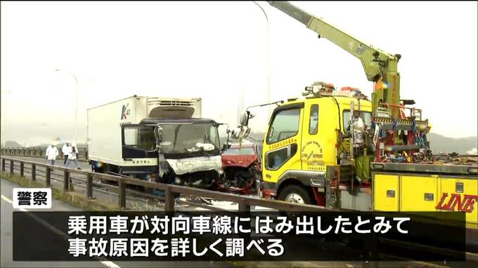 現場は片側1車線で、警察は、事故の目撃者やトラックの運転手の証言から乗用車が対向車線にはみ出したとみて事故の原因を詳しく調べています。