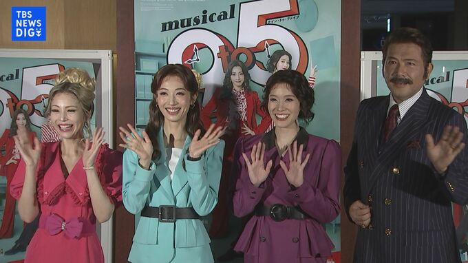 俳優の明日海りおさん、平野綾さん、和希そらさん、別所哲也さんが、ミュージカル「9 to 5」初日前会見&公開ゲネプロに登壇しました。