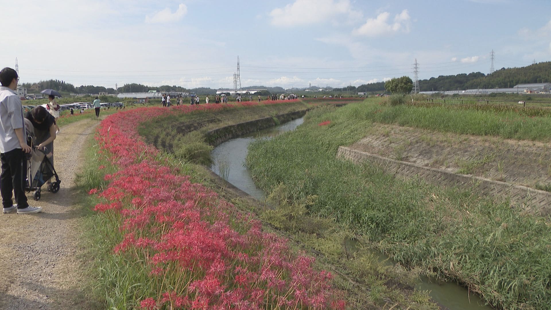 児童文学者、新美南吉の代表作「ごんぎつね」の舞台である矢勝川沿いには約300万本のヒガンバナが植えられています。ことしは9月に入っても、猛暑が続いたためか、例年より遅れて開花しました。