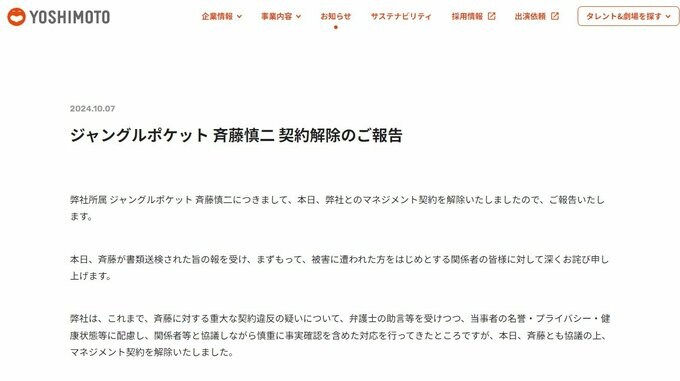 「弊社は、これまで、斉藤に対する重大な契約違反の疑いについて、弁護士の助言等を受けつつ、当事者の名誉・プライバシー・健康状態等に配慮し、関係者等と協議しながら慎重に事実確認を含めた対応を行ってきたところですが、本日、斉藤とも協議の上、マネジメント契約を解除いたしました」