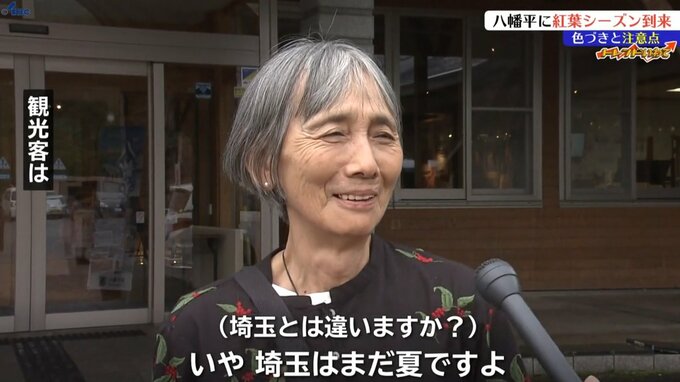 「埼玉の所沢です。(八幡平は何をお目当てに?)紅葉なんです。(もう見に行かれましたが?)ちょっと早かったかな。でも、少し色づき始めていて堪能できました。(埼玉とは違いますか?)いや、埼玉はまだ夏ですよ」