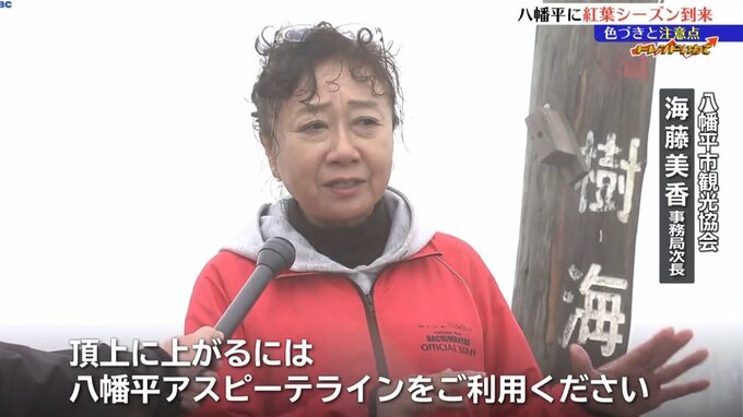 この秋の八幡平の紅葉を楽しむには少し注意が必要と八幡平市観光協会の海藤美香・事務局次長は言います。