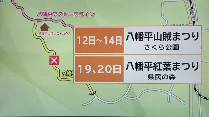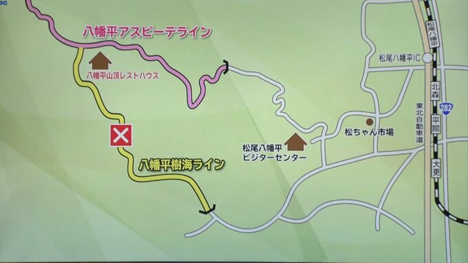 「八幡平アスピーテライン、八幡平樹海ラインがあるのですが、今現在、八幡平樹海ラインは通行止めになっていますので、上に上がって来るには八幡平アスピーテラインをご利用ください」