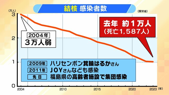近年、結核患者数は減少傾向にあるものの、去年は約1万人が感染し、1587人が死亡しました。2004年には3万人弱だった感染者数が、現在は約3分の1に減少しましたが、依然として警戒が必要な状況です。