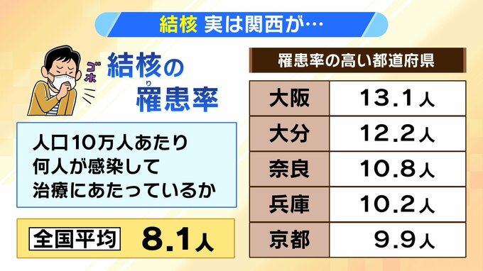 なぜ関西地方、特に大阪府で結核の罹患率が高いのか...その理由について、明確にはわかっていないものの、大阪府によりますと、大阪は人口密度が高い上に、高齢者の割合が高い。高齢者は免疫力が低いため、こういった数値が出るのではないか、という見方もあるということです。