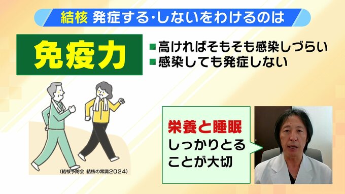 結核の発症予防には、免疫力が鍵を握っています。宮下教授によりますと、免疫力が高ければ、そもそも感染しづらく、たとえ感染しても発症しない可能性が高くなります。免疫力を上げるためには、「栄養と睡眠をしっかりとる、適度な運動をすることが大切」だということです。
