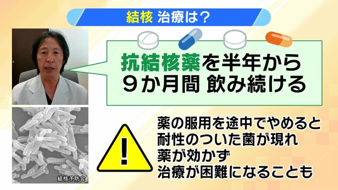 結核は薬で治療できます。宮下教授によりますと、抗結核薬を半年から9か月間、飲み続けるというもので、服用を途中でやめてしまうと、耐性のついた菌が現れ、薬が効かなくなり、治療が困難になることもあるということです。