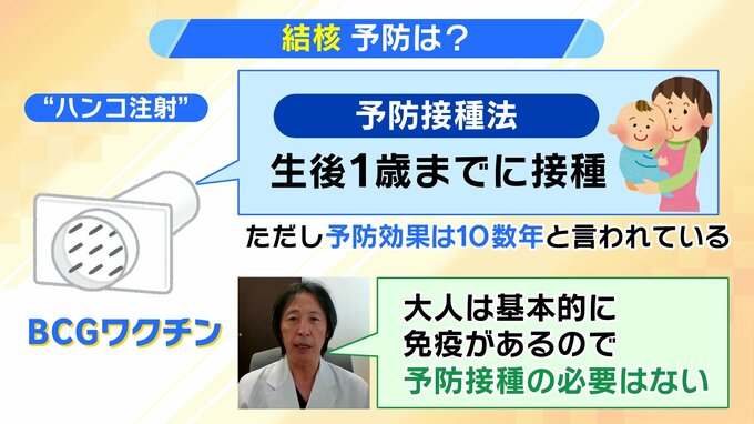結核を予防するために接種するのが、BCGワクチン。“ハンコ注射”とも呼ばれ、子どものころに予防接種を受けた人も多いのではないでしょうか。現在は、生後1歳までに接種となっています。ただ、この予防効果は10数年と言われています。