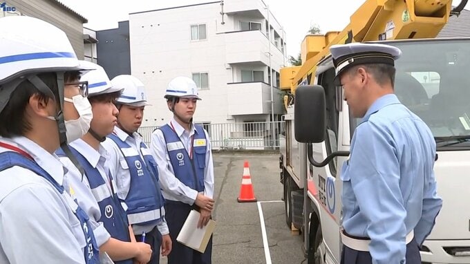 7日はNTTのグループ会社で高所作業車の運転を始めて1、2年目の若手社員8人が参加し、警察官の指導を受けました。