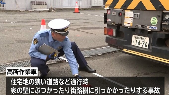 住宅地の狭い道路などを通行する高所作業車は、工事や災害の現場へ到着するまでに家の壁にぶつかったり、街路樹に引っかかったりする事故が多いといいます。