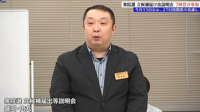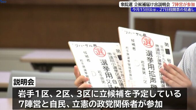 15日公示、27日投開票が行われる見通しの衆議院選挙について、小選挙区の立候補届出等説明会が7日盛岡市で開かれ、立候補を予定している7陣営の関係者が参加しました。