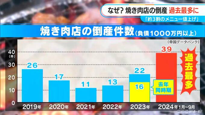 しかし今、焼肉店の倒産件数が過去最多のペースで増えています。帝国データバンクによりますと、ことし1月から9月までに倒産した焼肉事業者は39件。去年の同じ時期の2倍以上で、すでに年間の過去最多を更新しているのです。