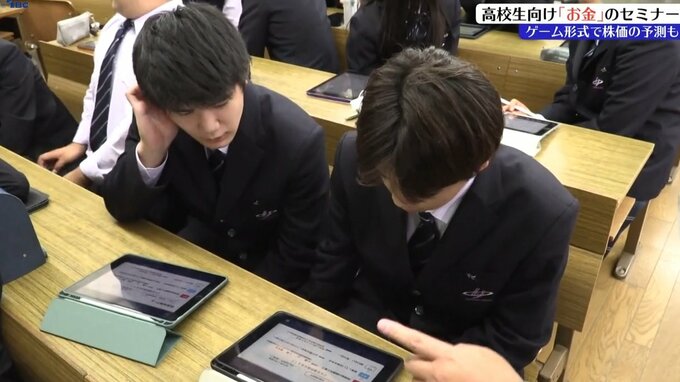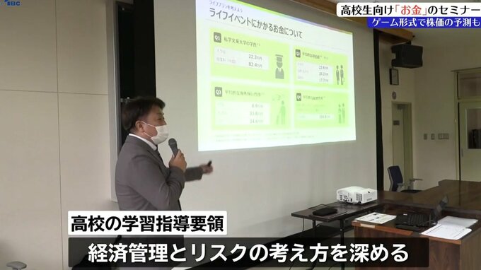 セミナーでは、進学や結婚などライフスタイルの変化に合わせてかかる費用について学んだほか、ゲーム形式で株価の推移を予測して金融の仕組みに理解を深めていました。