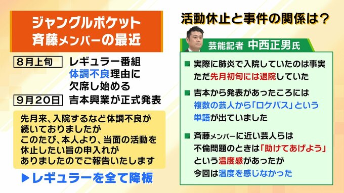 また、中西記者は、「斉藤メンバーに近い芸人らは、不倫問題のときは『助けてあげよう』という温度感があったが、今回は温度を感じなかった」とも話しています。