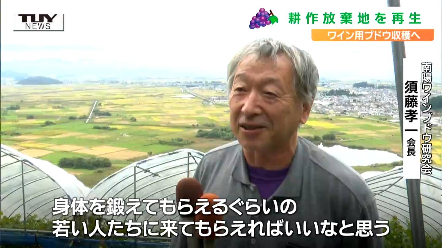 南陽ワインブドウ研究会 須藤孝一 会長「新幹線から見えるような場所で採っているのでその辺を思い浮かべながら飲んでいただけたらな。このロケーション。これを見ながらブドウを作る。そしてちょっと大変だけれども急なところを登り下りをしながら体を鍛えてもらえるぐらいの若い人たちに来てもらえればいいなと思う」