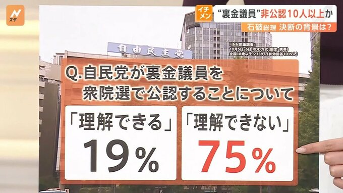 さらに、自民党が裏金議員を衆院選で公認することについて聞いたところ、「理解できる」が19%、「理解できない」が75%でした。