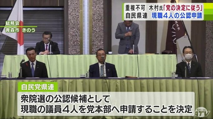 超短期決戦となる衆院選に向け、自民党青森県連は6日、公認候補として現職の4人を党本部に申請することを決めました。一方で、3区に出馬予定の木村次郎氏の重複立候補はできない見通しです。