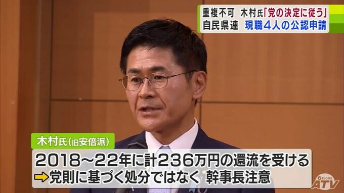木村さんは旧安倍派で、2018年~22年に派閥からあわせて236万円の還流を受け、党則に基づく処分ではなく幹事長による注意を受けていました。
