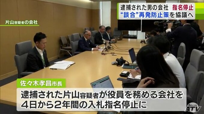 7日の定例会見で佐々木市長は事件に触れ。逮捕された片山弘一容疑者が役員を務める会社を、市の規定に沿って10月4日から2年間、入札指名停止としたことを明らかにしました。