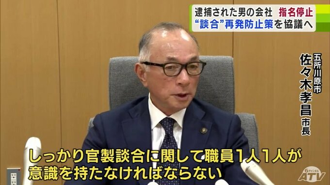 青森県五所川原市の佐々木孝昌市長は、定例会見で市が発注した工事を巡り、前の副市長ら3人が逮捕された事件について触れ、逮捕された男が役員を務める会社を2年間、入札指名停止としたことを明らかにしました。