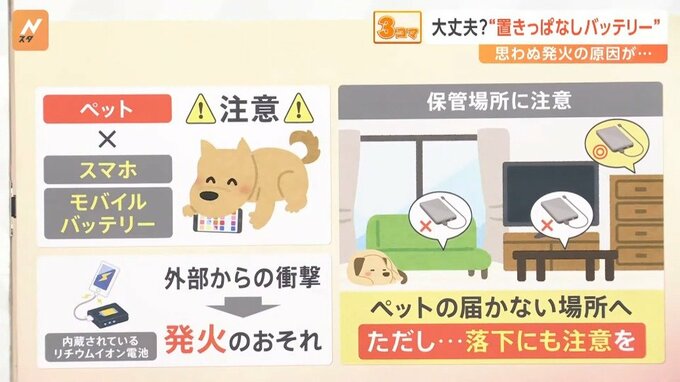 また、外部から衝撃があることで、発火のおそれもあります。高いところから落下したものを、ペットが噛んでしまうことも危ないそうです。
