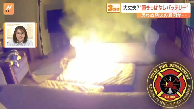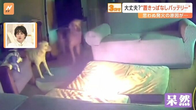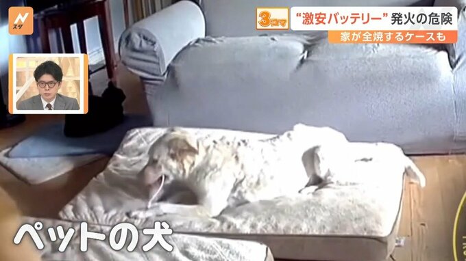 アメリカの民家で撮影された防犯カメラの映像には、ペットの犬がリチウムイオンのモバイルバッテリーを、口にくわえて噛んでいる様子が写っています。