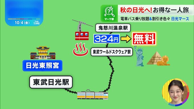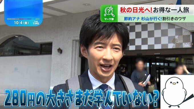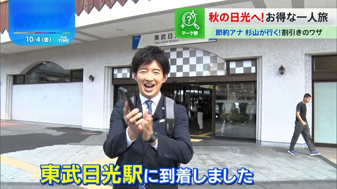 TBSイチの節約家、杉山真也アナが行くお得な日帰り旅行!第3弾の舞台は紅葉シーズン間近の栃木県日光市。携帯必須の「超オトクフリーパス」で巡ります。