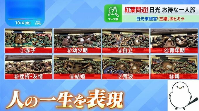 昔から猿は馬を守る動物といわれ、ご神馬とよばれる馬をつなぐ「神厩舎」の外壁には8枚の猿の彫刻があり、その8枚が「人の一生」を表しているといいます。