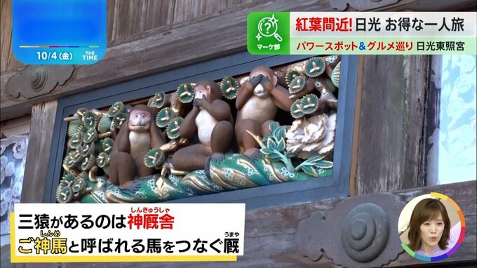 世界遺産にも登録されている日本屈指のパワースポット『日光東照宮』。紅葉の見頃は11月上旬からですが、国宝の「陽明門」や「眠り猫」、重要文化財の「五重塔」など見どころはてんこ盛り。中でも有名なのが、見ざる言わざる聞かざるの「三猿」です。