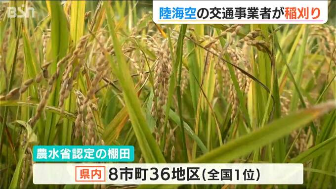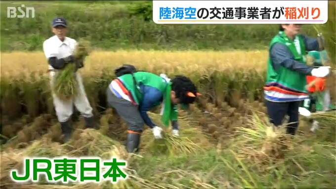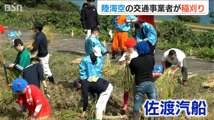 新潟県佐渡市の歌見地区にある棚田で6日、陸・海・空の交通事業者らが共同で“稲刈り”を行いました。