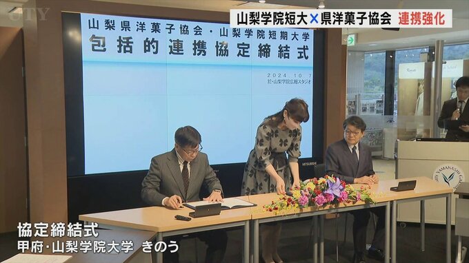 7日は連携協定の締結式が行われ、山梨学院短期大学の羽畑祐吾学長と県洋菓子協会の野田清彦会長が協定書を取り交わしました。