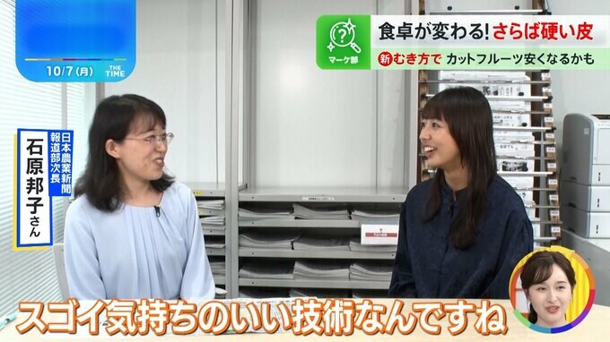 「あるものを使うと果物があっという間にツルンとキレイにむけるんです」と話すのは、日刊紙『日本農業新聞』の報道部次長、石原邦子さん。