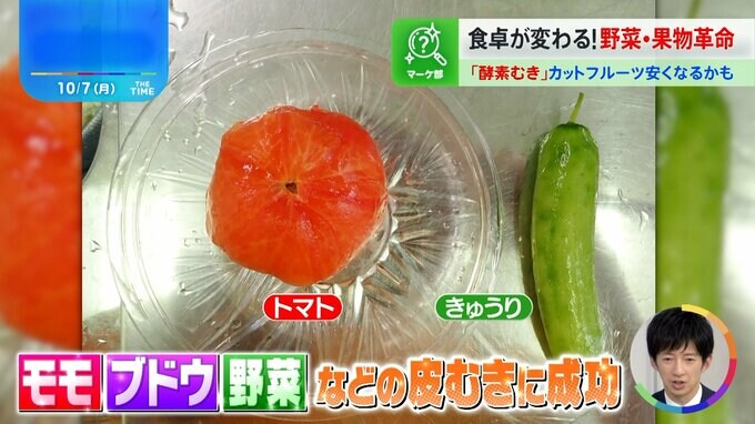 苦戦したのは皮が水をはじくブドウやモモで、フルーツごとに酵素の濃度を少しずつ変えて実験を繰り返し、今ではトマトやキュウリなどの野菜まで酵素で皮をむくことに成功!2024年1月には特許も取得しました。
