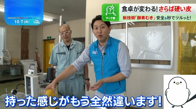 「持った感じが全然違います。皮が柔らかくなってます。うわ~!プチプチとはがれるように皮がむけます。めちゃくちゃ気持ちいい!」