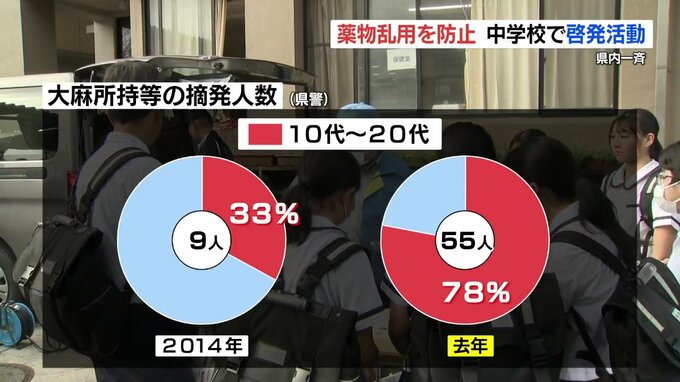 県警によりますと、若者の薬物使用による摘発数は県内でも増加傾向にあり、2023年に大麻で摘発された55人のうち約8割が10代と20代で、警察も注意を呼びかけています。