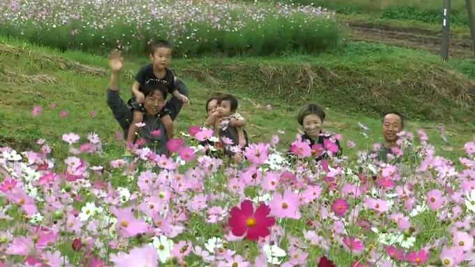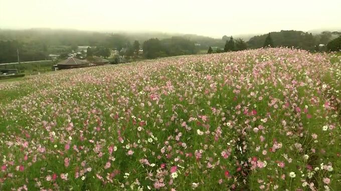 朝霧に覆われたコスモス畑。花には朝露がおりています。標高およそ500メートルの出水市・上場高原の8日朝の様子です。