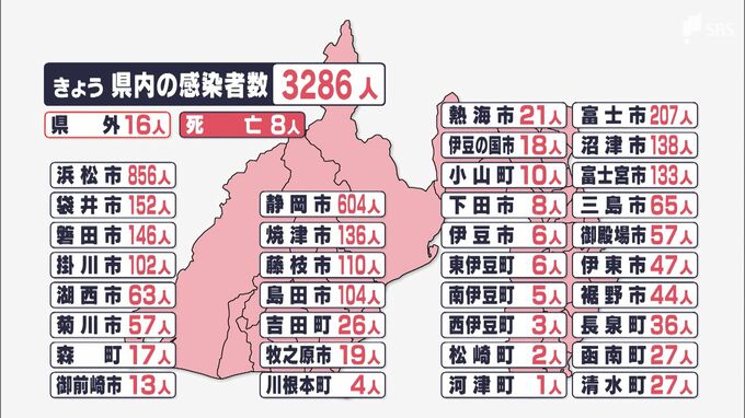 静岡県内では9月8日、新たに3286人が新型コロナウイルスに感染したことが分かりました。15日連続で前の週を下回っています。自治体別の感染者は、浜松市で856人、静岡市で604人、富士市で207人、袋井市で152人など…