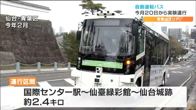 運行は今年2月に続き2回目で、自動運転のシステムを搭載したEVバスが地下鉄東西線国際センター駅、仙臺緑彩館、仙台城跡の間およそ2.4キロの区間を走ります。