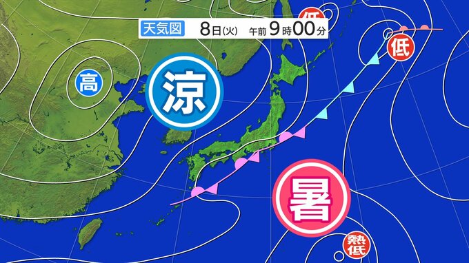 秋雨前線の北側は【涼しい空気】、南側は【暑い空気】に覆われています。秋雨前線が南下し、前線の北側の涼しい空気が関東地方に流れ込んだために、きのう7日(月)よりも大幅に気温が下がりました。夏の暑さから、一気に、秋の空気に入れ替わりました。