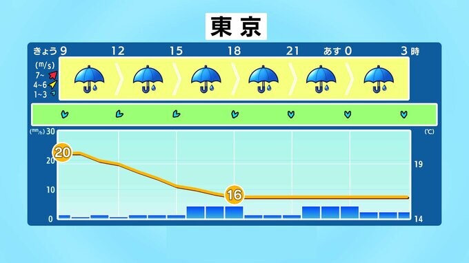 8日(火)の東京は、最高気温を午前0時過ぎに25.3℃を観測した後、どんどん気温が下がっていて、きのう7日(月)正午28.8℃→きょう8日(火)正午19.2℃と、10℃も低くなりました。しかも、雨も降っているため気温以上に寒く感じそうです。
