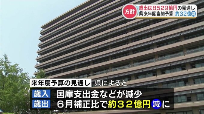 県によりますと、来年度は新型コロナ関連の国庫支出金の減少などで歳入が減るため、歳出も今年度の6月補正予算段階と比べ、約32億円少なくなる見通しです。