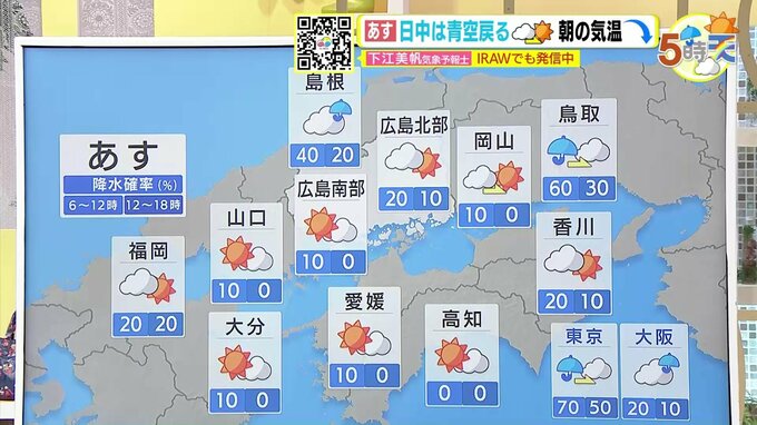 朝の気温はけさと同じくらいの所が多く、平年より高い予想です。ただ、日中の気温はきょうよりも5℃以上高く、半袖でも過ごしやすいくらいの気温になります。晴れると今度は朝晩と日中との気温差が大きくなるので服装に注意が必要ですね。