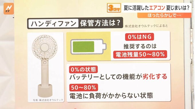 夏に使った人も多いであろうハンディファンに関して、株式会社オウルテックによると、保管する際にバッテリー0%はNGで電池残量は50%から80%が推奨されているということです。